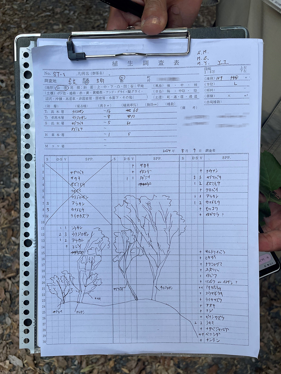 本物の森を作るため、潜在自然植生※の構成種による植樹を行うことにしました。全国各地にある神社の鎮守の森などには、古来より伐採を逃れ保全された自然林が残されていることが多いことから、奈良研究開発センターの近くにある神社の森での調査からはじめました。森は、ただ木があれば良いのではなく、小さな木、中くらいの木、大きな木、多種・多様な木があることが大切です。どれか一つが優れているということはなく、様々な種類がまとまりで存在することで強くなれます。一人では生きていけないのは木も一緒です。今回は、調査の結果から15種類285本の苗木を植えることにしました。
